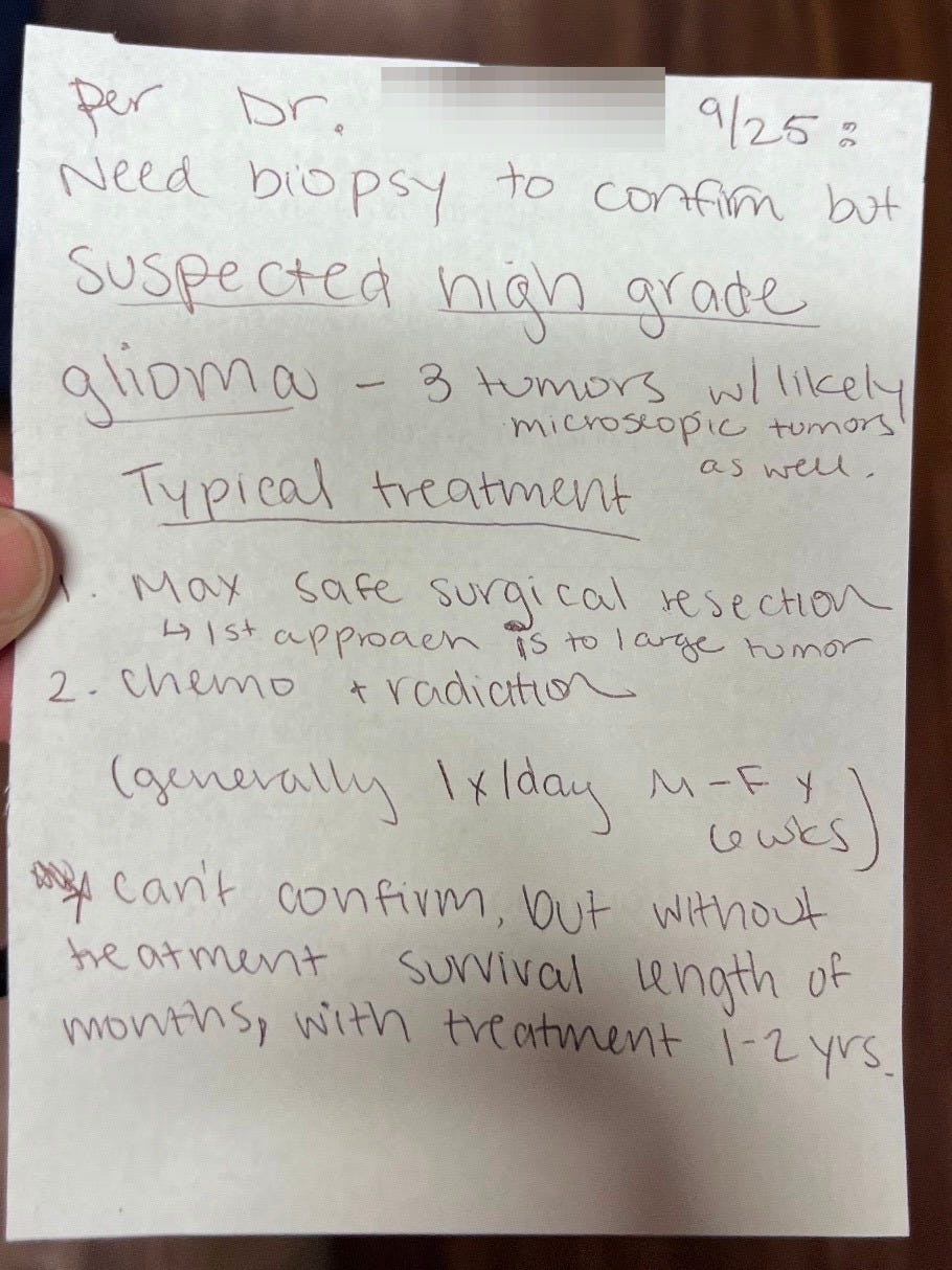 The shift was immediate. One day we were on one of our many FaceTimes and I noticed she seemed slightly off, slower to respond, her face flushed, something about her presence different. Not long after, I was driving to the ER and hearing she had suffered a massive brain bleed. Within 48 hours we were discussing multiple tumors, urgent surgery, and a vocabulary none of us understood: high-grade glioma, resection, GBM.